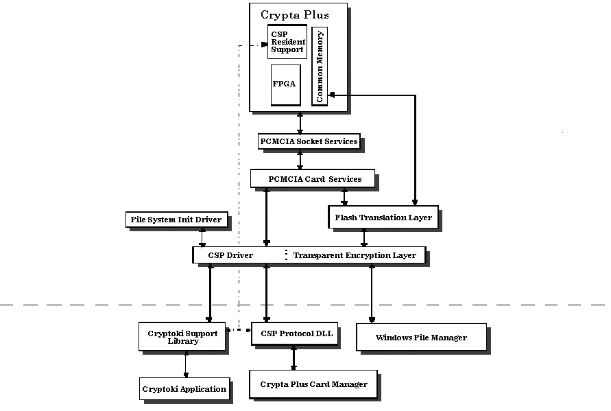 The first component is Motorola 6805 instruction code which is resident in the CSP memory space of the Smart Token card. The other components are loadable or installable drivers and applications that execute on the host machine. A configuration for these components is illustrated in Figure 1. In this scheme, the CSP and encryption support driver is a DOS TSR application which is loaded at boot time and executes in real or virtual 86 processor modes. The card and socket service components are contributed by SystemSoft and provide PC Card 2.1 compliant support for Smart Token card interfacing. A Smart Token specific DOS driver is provided which implements a card service vendor specific call to reinitialize file system components when required by Smart Token protocols. The flash translation layer (FTL) is a SystemSoft character driver which emulates a random access block device on a flash platform. In Windows, several components allow for high level application and end-user card management. The CSP protocol DLL implements an API for performing CSP operations through the CSP driver. The Cryptoki support library implements a similar interface packaged into a Cryptoki API set. Cryptoki applications may link with the library to receive Cryptoki support on the Smart Token platform. The Windows File Manager is the standard Windows 3.1 file system management application, and represents any number of high level file components running in Windows protected mode. Lastly, the Smart Token Card Manager is a Windows protected mode GUI administration utility.