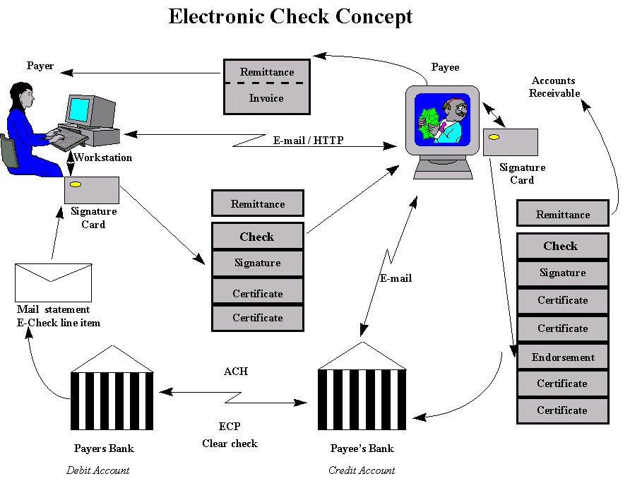 Figure 2 above depicts the typical Electronic Check flow. The payer receives an invoice from payee, generates a Electronic Check and sends it to the payee via email. The payee then emails the received payment to his bank and settles the transaction with payer's bank