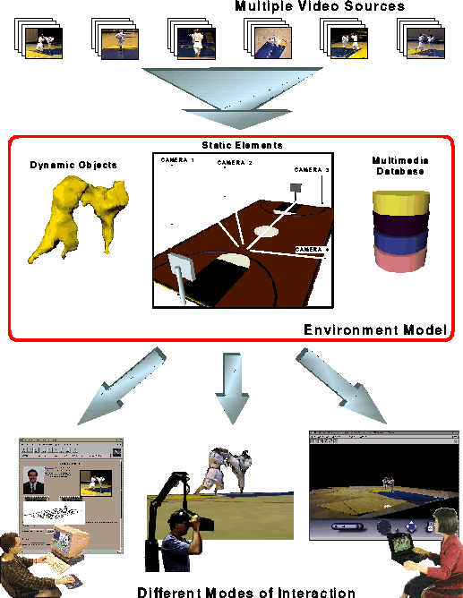 Content-centric interactivity can be implemented by combining the tools and techniques that are being developed in different aspects of computer science, including evolving information systems and the delivery mechanisms created by the network infrastructure commonly available today. The image stream from each camera is processed to extract task-dependent information from it and is fed to an information system, called the Environment Model (EM). The EM is a coherent, dynamic, multilayered, three-dimensional representation of the content in the video streams. It is this view-independent, task-dependent model that bridges the gap between two-dimensional image arrays, which by themselves have no meaning, and the complex information requirements placed by users as well as other components on the system. The environment modelis an active real-time database containing spatial and object information at several levels of abstraction. The assimilated information contained in the environment model allows us to achieve gestalt vision[2] where the whole is greater than the sum of the parts.