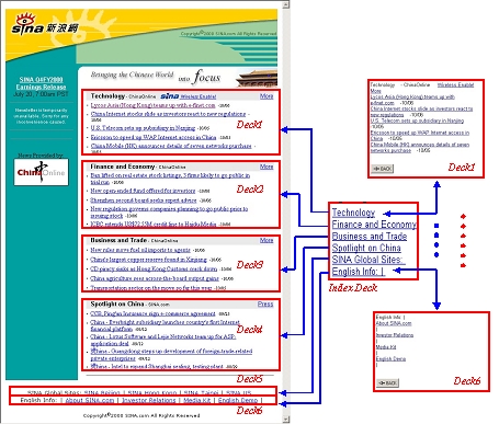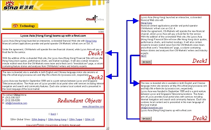 Figure 10 shows an adaptation example for an Index Page, in which contents with unsupported media type are removed, and several new decks are generated to show the original content at different layer. The Index Deck is an outline of the original page. Detailed contents are in Deck 1-6. To simplify the adaptation process, here we only use decks to present the adapted content for WAP device, and cards are not considered. Figure 12 shows the adaptation result in a WAP simulator. Figure 11 shows the adaptation result of a Content Page, in which redundant contents are removed, and the original page is divided into two decks because of the memory limitation of WAP device. The two examples in Figures 10 and 11 are all practical adaptation results for an existing website. For more results please visit our website: