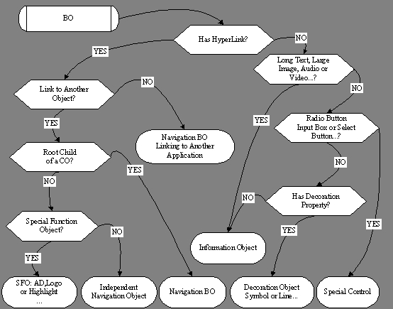 As described above, Specific FOM represents an Object with its category. For a BO, its category is mainly determined by the major properties of the BO, the properties of the Father/Brother Objects. A rule based decision tree is applied to determine the category of BO. Figure 3 illustrates the basic idea of BO category detection.
