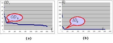 where OD0 and ID0 are two constant variables determined by the website. To find OD0 and ID0, we first sort the pages by OD and ID in descending order, respectively, and draw the corresponding OD(i)-i and ID(i)-i diagram of a website (i is the ordered number of a web page). Figure 4 gives an example of OD(i)-i and ID(i)-i diagram for Yahoo! Chinese news website (1,615 pages). By statistical analysis to many websites we find that OD0 and ID0 are generally the inflexions in OD(i)-i and ID(i)-i diagram as shown in Figure 4.