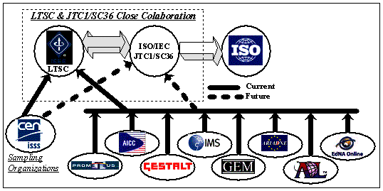 The e-learning standardization process is an active, continuously evolving process that will last for years to come, until a clear, precise, and generally accepted set of standards for educational-related systems is developed. Among the main contributors to this effort let us mention the IEEE's Learning Technology Standardization Committee (LTSC) [1], the IMS Global Learning Consortium [2], the Aviation Industry CBT Committee (AICC) [3], the US Department of Defense's Advanced Distributed Learning (ADL) initiative [4], and projects Alliance of Remote Instructional Authoring and Distribution Networks for Europe (ARIADNE) [5], Getting Educational Systems Talking Across Leading Edge Technologies (GESTALT) [6], PROmoting Multimedia access to Education and Training in EUropean Society (PROMETEUS) [7], European Committee for Standardization, Information Society Standardization System, Learning Technologies Workshop (CEN/ISSS/LT) [8], Gateway to Educational Materials (GEM) [9], and Education Network Australia (EdNA) [10]. The IEEE's LTSC is the institution that is actually gathering recommendations and proposals from other learning standardization institutions and projects (c.f. Figure 1). Specifications that have been approved by the IEEE go through a more rigorous process to become ANSI or ISO standards. In fact, an ISO/IEC JTC1 Standards Committee for Learning Technologies, SC36 [11], was approved in November 1999.