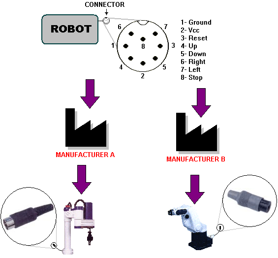 At this level, standards define the expected behavior of software components responsible for managing learning objects in online environments. Revisiting the car manufacturing example above, second level standards would specify the interface for the robots that assemble tires in a production line. These specifications let different manufacturers to produce robots with the same behavior (c.f. Figure 4). Performance may vary but the expected behavior as defined by the specification (top of the figure) must be implemented by different manufacturers' robots (bottom of the figure). Therefore, a production line could be composed of robots developed by different manufacturers provided they are compliant with the defined specification to support interoperability. In the same way, software interfaces for educational components would allow us to build new online learning systems avoiding their development from scratch, and also to provide interoperability among heterogeneous systems at runtime.