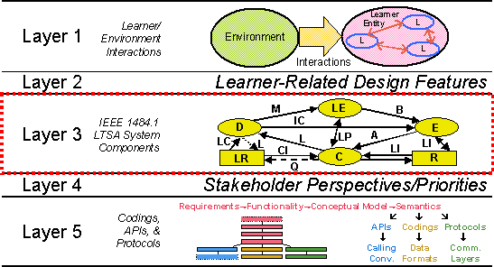 At this level of standardization, proposals to define such systems range from the specification of conceptual models to concrete interfaces for CMIs. The IEEE LTSC's Architecture and Reference Model working group delivered in November 2001 the 9th draft of the Learning Technology Systems Architecture (LTSA) [32]. The LTSA specification corresponds to a conceptual model applicable to a broad range of learning scenarios. It is pedagogically, content, culturally and platform neutral. Although five refinement layers are specified (c.f. Figure 5) only layer 3 is mandatory. This layer identifies the architecture components, comprising four processes, Deliverer (D), Learning Entity (LE), Evaluation (E) and Coach (C); and two stores, Learning Resources (LR) and Learner Records (R).