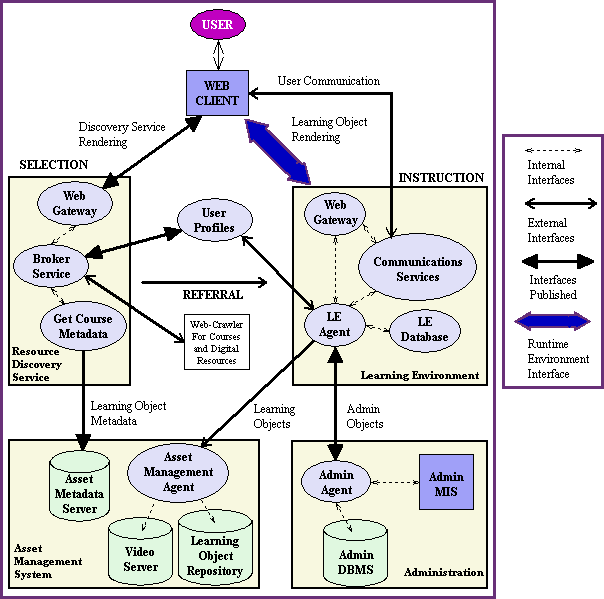 Our purpose is to contribute to this second level of standardization by the identification of common services for e-learning that will be supported by a Reference Architecture. This architecture will be composed of reusable software components with open and clearly identified interfaces. All interfaces in the architecture define their externally visible properties to facilitate the development of distributed, interoperable, and standards-driven online learning environments.