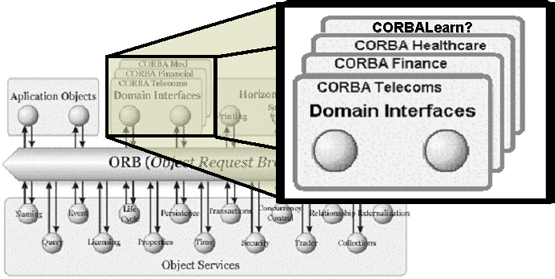 As a part of our contribution, we propose a concrete instance of the Reference Architecture for a particular implementation. The selected technology is CORBA [35], an object-based distributed architecture that allows distributed and heterogeneous applications to interoperate on a network. CORBA is a standard defined by more than 800 institutions that form the Object Management Group (OMG) [36]. Over a software bus, the Object Request Broker (ORB), CORBA objects interact with each other via standard contracts written in the Interface Definition Language (IDL). The OMG has also defined the interfaces for 17 basic services for distributed computing [37]. Nowadays, one of the key activities is the definition of higher level services, clearly oriented to a particular business domain: domain CORBA facilities. Already available domain facilities [38] are targeted to domains like Telecommunications, Manufacturing, Finance or Healthcare (c.f. Figure 7). They identify the objects needed, and their interfaces, in those domains to cover the needs of a wide range of requirements. Different vendors may change the implementation, but the offered functionality is basically the same thanks to the agreed interfaces.