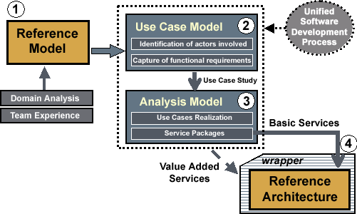 The Reference Architecture is a decomposition of the Reference Model, reflecting all components implementing the functionality identified in steps 2 and 3 of the proposed methodology (c.f. section 3.1), together with the corresponding data flows. Basic functional requirements are fulfilled by the Reference Architecture, whereas others, qualified as "value-added services", are assigned to the wrapper (c.f. Figure 8). The Reference Architecture is obtained from a detailed analysis of the functional requirements, and includes further specific requirements identified along this analysis process. Elements in the Reference Architecture are identified from loosely coupled service analysis class packages, which in turn are composed by tightly coupled objects. The proposed Reference Architecture [12] is a service architecture enabling component reuse. This is the main reason to adopt as the building blocks of the Reference Architecture the service packages identified along the process described in section 3.1. A further insight into the methodological approach to obtain this architecture can be found in [49].
