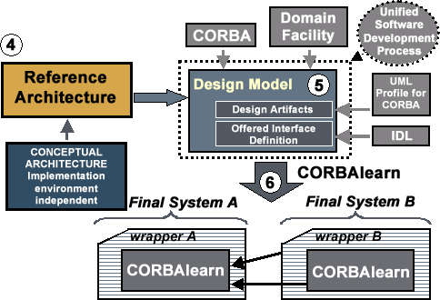 Thus, this proposal is materialized as a CORBA domain facility for e-learning: CORBAlearn (step 6). CORBAlearn is a specification, as it is the LOM specification for metadata; where CORBA was chosen as the implementation/deployment environment, as XML provides a concrete representation for LOM. Services offered by CORBAlearn are used by developers of final e-learning platforms, who would add a wrapper that makes use of them and adds application-specific value-added services to differentiate systems from different vendors (see bottom of Figure 9). Also, the core provided by CORBAlearn, whose specifications would be published in the framework offered by the OMG and its domain facilities, would support interoperability among heterogeneous platforms.