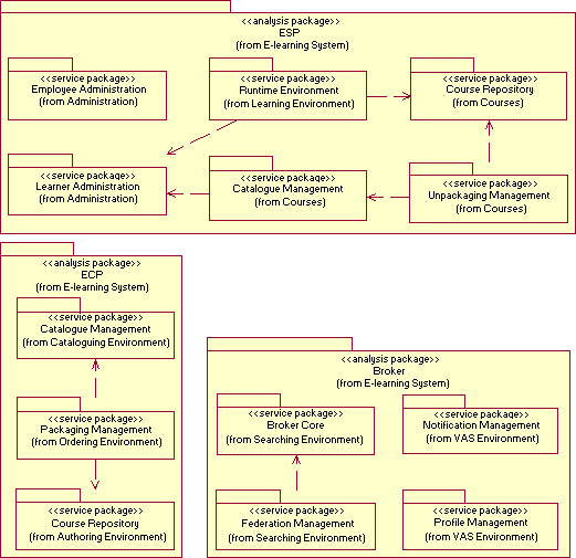 Service packages are the foundation of a Reference Architecture for standards-driven e-learning systems (step 4). The Reference Architecture is a decomposition of the Reference Model into a set of components that provide the functionality identified along previous stages (steps 2 and 3). Note that, in a general sense, our objective is the definition of a set of services to facilitate and speed up the development of standardized, distributed and interoperable e-learning systems. Thus, we will only include in the service packages determining our architecture those analysis classes offering basic, common services. Additionally, the selected classes should be reusable and independent from specific learning domains or specific value-added services. Specific subsystems in the architecture should be implemented in an integral manner. In fact, these subsystems model class groupings that typically evolve together. Those analysis classes that are too application-dependent or represent value-added services will be assigned to the wrapper. Final applications demanded and used by the actors in the use case model will be composed by the defined service packages and analysis classes external to them. As in other standardized fields, external components (i.e. external analysis classes) will provide specific features and value-added services that characterize individual, may be competing learning systems. In other words, this external wrapping will provide a differentiation among proposals from distinct developers and institutions.