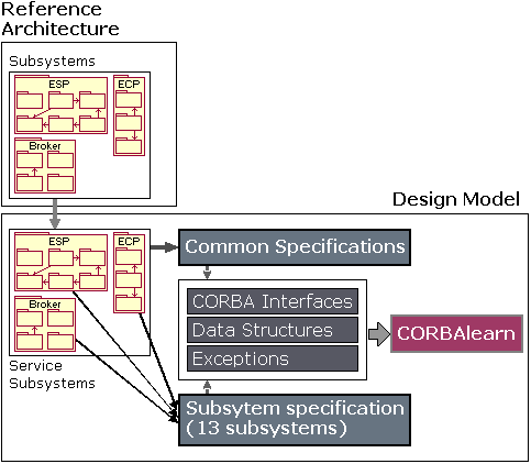 Services supported by the Reference Architecture and eventually provided by CORBAlearn are the consequence of the application of an appropriate design methodology. This methodology, which can be seen as a side contribution of this paper, is devoted to the definition of service architectures starting from user requirements. It is based on the Unified Software Development Process [39] together with the recommendations by other authors [12]. The Unified Process' aim is to obtain a final product. On the other side, our aim is to define a service architecture to build final applications upon it. For this, we adapted the Unified Process to serve our needs. We included a Reference Model as an initial stage and defined a Reference Architecture as an intermediate stage. The overall process is illustrated in Figures 8 and 9. Modeling was made using the Unified Modeling Language (UML) [40] and its profile for CORBA [41].