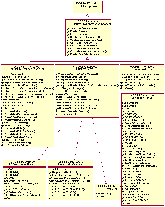 Figure 14 shows some of the interfaces included in the CORBAlearn Runtime Environment subsystem. Note that the figure only presents method definitions but not the parameters for each of them. The purpose of these interfaces is to support interoperability for runtime environments. As a result, developers of final e-learning systems are freed from common design tasks, like learning object delivery, student tracking or evaluation. Service interfaces presented in the figure are:
