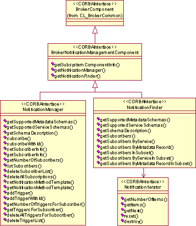 As example for the Broker, Figure 16 shows the interfaces that describe the CORBAlearn Notification Management specification. The main interfaces are Notification Manager and Notification Finder. Both of them provide introspection methods to discover the formats for resource description (i.e. metadata), and service descriptions supported by the implementation of each one of them.