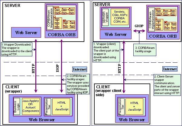 On the left side of the figure, the whole wrapper is downloaded to the client, both the presentation tier and the business logic implemented by the wrapper. HTTP is used for downloading, while Internet Inter ORB Protocol (IIOP) is used to access CORBA objects for subsequent accesses to CORBAlearn services.