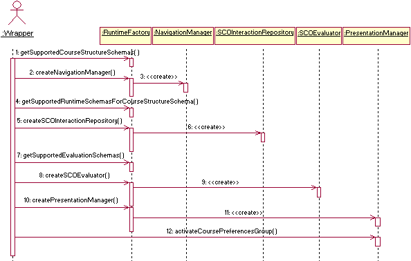 First, developers take advantage of the different services needed for each active learning session using objects created by the Runtime Factory. Figure 18 shows a sequence diagram with the steps the wrapper must follow to activate all needed objects. Steps 1, 4 and 7 represent calls to the introspection methods used to discover the actual information models coming from the first level of standardization that this particular implementation of CORBAlearn is able to deal with.