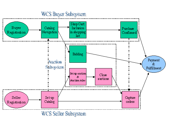 From a bidders’ perspective participation in an auction involves the following four steps: 1) registration, which could be optional for an observer but required for participants placing bids; 2) Navigable catalog to find products on auction and learn about them; 3) Interface for bidders to bid for products on auction, keep track of their bids and learn about competing bids as consistent with the auction rules; 4) Settlement at closing of the auction if the bidder happens to win. As shown in Figure 1, the first, second, and fourth steps are common to fixed price based trading in conventional e-commerce systems, Websphere Commerce Suite (WCS), being an example of one such commerce system. Therefore, to support auctions in WCS we implemented just the bidding subsystem, ensuring that it interfaced seamlessly with the payment and fulfillment subsystem and the catalog. Minor changes were needed in the catalog to display products on both auction and fixed price sales. Details of the bidding subsystem our outside the scope of this paper but Section 4.2 contains the usability perspective.