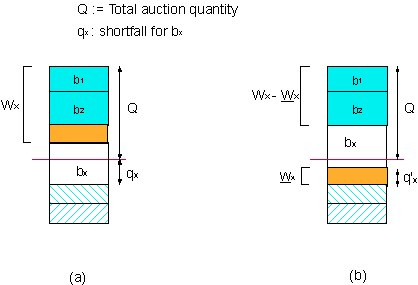 The above step is then repeated for the remaining bids including bids in Wx and the remaining unallocated quantity. This process continues until we have either exhausted looking at all the bids or the remaining auction quantity becomes zero.