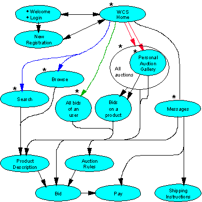 Figure 3 shows how the bidders navigate the auction web site in the auction implementation. Each bubble shows a web page and arcs from one page to another indicate that a hot link is available from the first page to the second. The seven pages marked with asterisk can be accessed any time from the side bar. The auction site URL puts a bidder on the Welcome page from where a registered user can authenticate himself to the web site and initiate a secure session (login). An unregistered user will get the opportunity to fill in a registration form that may be processed online or off-line. After registering, the bidders can browse through or search the products in the auction site, which will possibly result in a product being selected, and its description presented to the bidder. If the product is on auction, the rules of auction can be viewed, and bids can be submitted for that product.