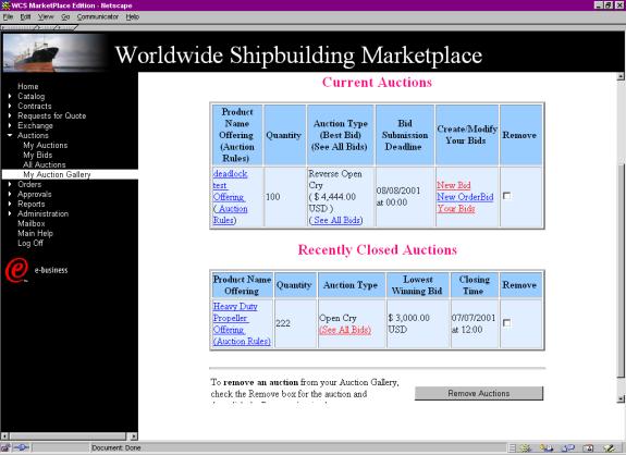 From the home page the bidder can also see a list of all auctions at the auction site or a subset of these that are in his personal auction gallery (See Figure 4). An auction gets added to a bidder/shopper’s auction gallery when the bidder explicitly takes an action to do so from certain auction pages, or implicitly when the bidder places his first bid. From both lists, all auctions or auction gallery, the bidder can select an auction and access the description of the product being auctioned, see the rules of the auction, or bid on the product. For open cry auctions he can also see a subset of the previously submitted high bids for that product. In both these lists, the entry for an auction also includes the auction type, quantity being auctioned (if the rules permit), best bid or current asking price for open cry and Dutch auctions respectively, and auction closing time if determined.