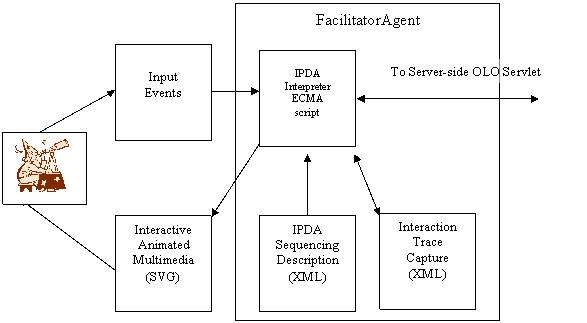 The current OLO Client-side architecture can be classified as that of a Situated MicroAgent [26, 33] playing the role of FacilitatorAgent. Formally it is an Interface Push Down Automaton (IPDA)[27] implemented through an interpreter, and programmed for reactive (situated) behavior using a data-driven approach. This FacilitatorAgent provides learner-side interactivity and animation using a state-sequencing specification derived from the Animation and Interaction layers. The interpreter portion of the FacilitatorAgent is coded using generic ECMAscript code that is downloaded as part of the client-side OLO. The general structure of the OLO Client-side architecture is shown in Figure 4, and each block is described in what follows.