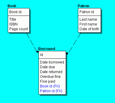 one-to-many relationships, one from Book to Borrowed and one from Patron to