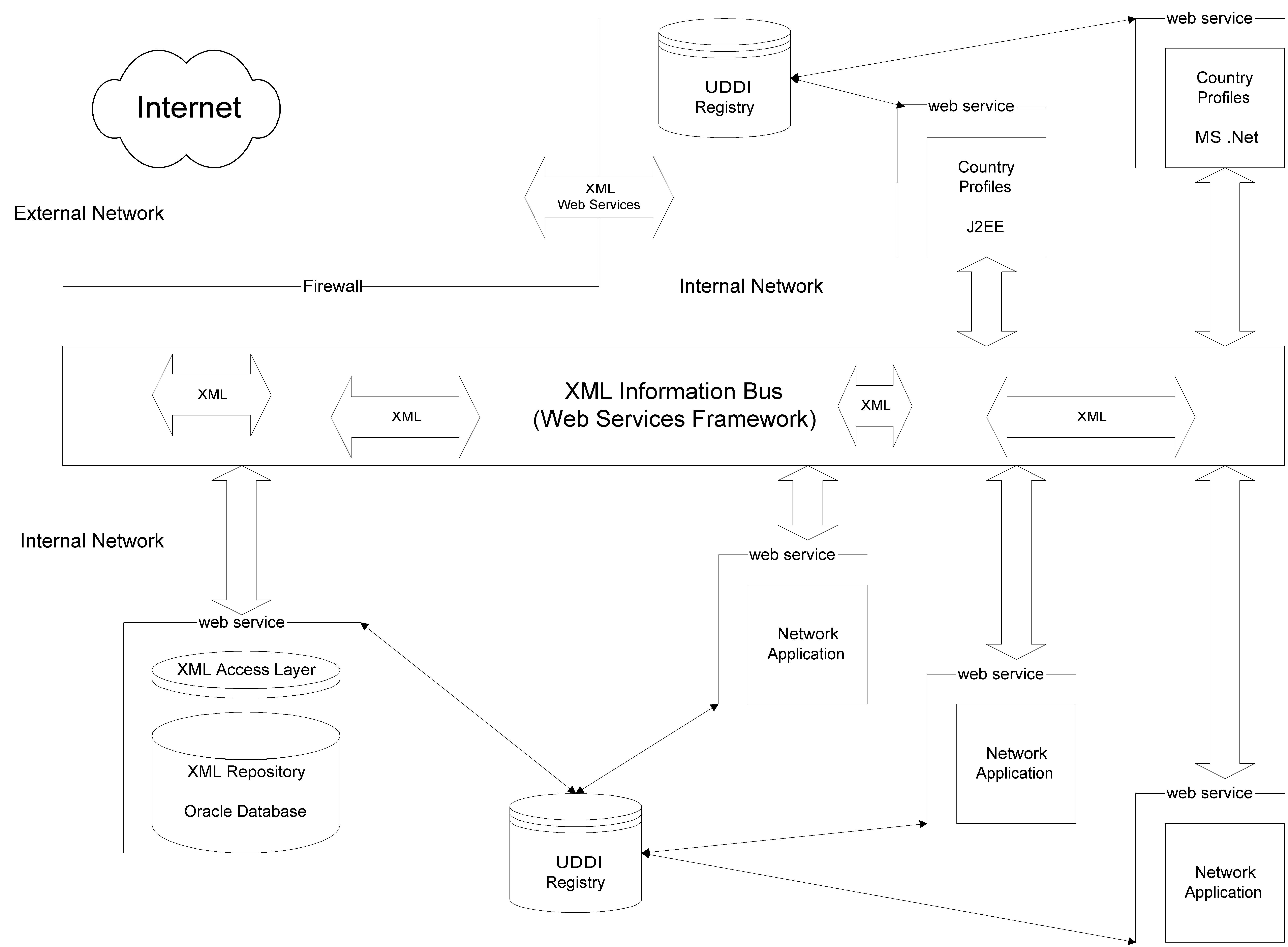 The concept of the XML Information bus is that all data passes through it in standard XML formats. These formats can be imposed in a regulated fashion by publishing the XML schemas used and validating instances of messages. Regardless of the formats used by the existing systems, the same XML syntax is used for input and output parameters on the Web Services. For example, all data related to country, language or currency is represented in a single XML format which uses: