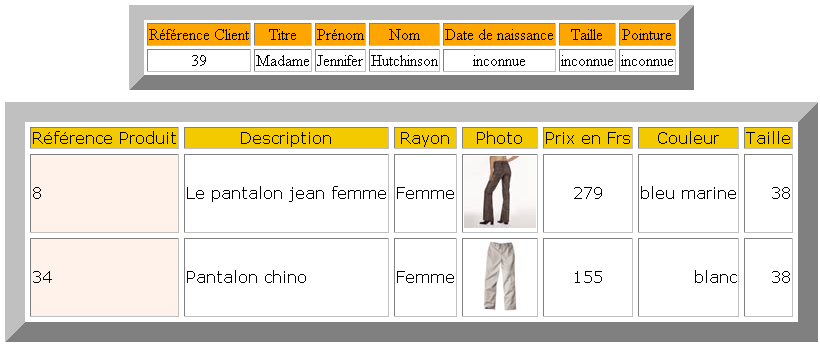 As we can see on the Figure 7, at the beginning of the dialog, the size of this client is unknown in her profile's file (the French words "Taille : inconnue" in the first table, can be translated as "Size : unknown"). So the machine asks the client's size in order to help to choose a suitable trousers for the consumer. In a future transaction, the machine will suggest the size or the section according to the user profile and collected data.