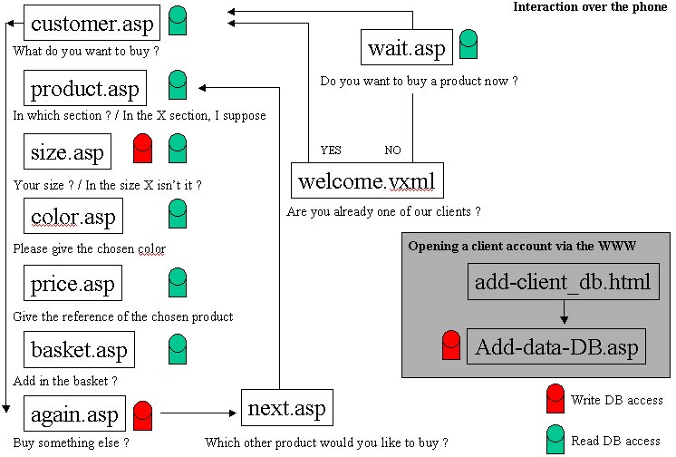 The Figure 1, gives a synoptic vision of the dynamic application files, in which we can see the course a user should follow in order to buy clothes and others goods, and to add it in her virtual basket. Both, visual and phone-based interactions are used in this man-machine dialog.