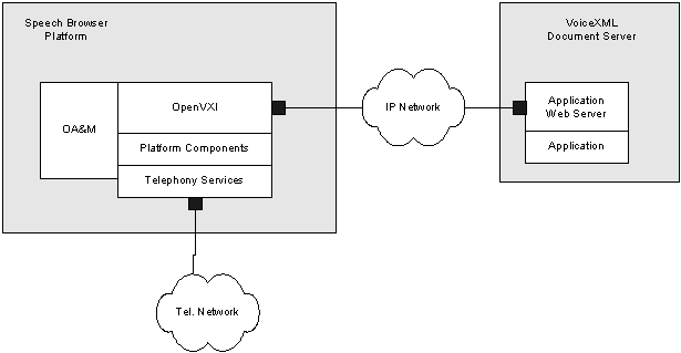 The figure also shows the system architecture where the OpenVXI is integrated onto a platform by adding recognition, text-to-speech technology and platform monitoring, administration, and hardware functionality. This integrated platform receives VoiceXML pages from a document server. The document server consists of a web server, potentially an application framework, and a VoiceXML application. The VoiceXML application can be one or more VoiceXML files, or these files can be dynamically generated using CGI scripts or other computations.