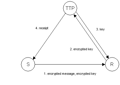 Figure 1 shows a high-level sketch of the protocol. Let us first describe the steps of the protocol without going into detail. In step 1, the sender encrypts the message using a freshly generated key, encrypts the key with the public key of TTP, and sends this along with the encrypted message to R. In step 2, R sends the encrypted key to TTP as a request to release the key. If TTP is satisfied that the request is legitimate it sends the key to R in step 3 and sends a return receipt to S in step 4. R can then decrypt and read the message.