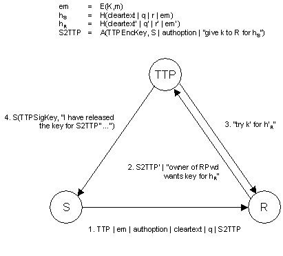 Proof sketch: R cannot read m without first receiving a message containing em = E(k,m). It therefore cannot read mwithout receiving k from TTP. The non-malleability of the encryption function A ensures that the only way for R to obtain the key is to forward the field S2TTP' = S2TTP to TTP.(The non-malleability property is important since R serves as a communication channel between S and TTP. If A() was malleable it might have been possible for R to change the encrypted information, say from ``give k to R for h'' to ``give k to R for h'''. This option enables R to send wh' instead of h to TTP, and results in S not being able to present a valid receipt for the message m.) The protocol ensures that when TTP sends k to R it also sends a signed receipt to S. (We assume that both of these messages arrive at their destinations.) The receipt contains an authentication of R's identity (in a form depending on authoption), and a value S2TTP'' which is equal to the value S2TTP generated by S. This value is S2TTP = A(TTPEncKey, S | authoption | ``give k to R for HS''), where HS = H(cleartext | q | r | em). S can therefore reveal m as well as k, q, r, and cleartext, and show that they correspond to the value signed by TTP.