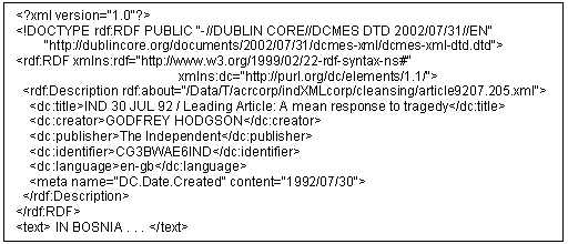 Given the sparseness of uniform XML pages on the Web, we have created a test-corpus of news articles in this format, making use of the Dublin Core Element Set. Meta-information can be automatically extracted or inferred from the standard annotation accompanying each article. An example of page structure is shown in Figure 1.