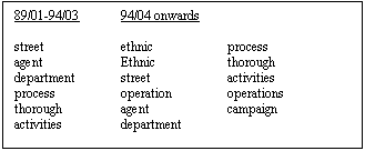 The existence of date metatagging in Dublin Core allows WebCorp to extract and label those contexts in chronological order. Secondary analyses are also possible; e.g. collocational profiles, which show the word ethnic, reflecting the meaning `genocide’, as becoming the major significant collocate of cleansing from 1994 onwards. Results are shown in Figure 3.