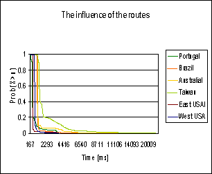 To study the influence of the route on the files TDD, we compare the TDD of the same file, transmitted from the same server to different clients. In the simulation, the clients were located in East and West USA, Portugal, Brazil, Australia and Taiwan, and the server was located in Israel. These routes are known from previous research to have different quality parameters. The simulation result is shown in Figure 2. The TDD of all files is Pareto. The shape parameters are similar and the location parameters are different.