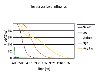 To study the influence of the server load on the files TDD, we compare the TDD of the same file, transmitted from the same server, working under different loads, to the same client. We examine five different load levels, from 'no-load' to 'high-load'. The server load is increased by adding more local clients. The simulation results appear in Figure 3. Both the shape parameters and the location parameters are different.