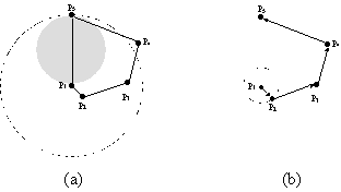 In the second phase, we eliminate the critical links that are replaceable with alternative paths. For each critical link ( u, v), node u tries to search a path that reaches node v based on its local information. We call such path the replacing path of (u, v). Whenever a node u finds itself having the highest priority and ps (u) > 0 within its two-hop neighborhood, it starts a search for the replacing paths. The searching process is based on Dijkstra's algorithm. However, for each node u, no global knowledge of the network topology is available, consequently, we ask u to construct a subgraph G' (u) = (V', E') on top of GG (G) based on the location and transmission radius information of the nodes in its vicinity. A node vi belongs to V' if vi is within u's two-hop neighborhood of UDG (V). An edge (vi , vj) belongs to E' if ||vivj|| £ radius (vi) and (vi, vj) belongs to the edges of GG (G). After the construction of G' (u), node u applies Dijkstra's algorithm on it to search for the shortest path Pmin (u, v). If no such path exists or p (Pmin (u, v )) is more than c times larger than the weight of (u, v), then the searching procedure is ended and ps (u) is set to 0. Otherwise, Pmin (u, v) is the eligible replacing path of (u, v), and (u, v) is excised. Figure 1. gives a illustration: in Figure 1 (a) the solid lines are the logical links of GG (G) and are all bi-directional. The area covered by the dotted line is the transmission range of p1. Note that there should be no other node in the gray area. The transmission range (and thus the transmission power) of p1can be largely reduced by applying our algorithm as shown in Figure 1(b).
