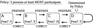 Here are some examples of policy application. Figure 5 shows typical coordination of schedules. The policy is specified as "At least 3 persons MUST participate." In the situation that C does not have free time for requested meeting, the ROUND_TRIP message(with PREPARE state) for arrangement of a meeting is passed to participant nodes in order A,B,C and D. On receiving the message every node checks its free time for the meeting and reads attached policy.