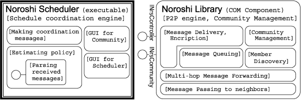 Our system consists of two modules. One is the Noroshi library dealing with the One-Writing Method and wireless P2P communications. This corresponds to the above-mentioned message delivery layer. The other is the Noroshi scheduler running over the Noroshi library, corresponding to the schedule coordination layer. The Noroshi library has been developed as a COM-library for the reuse in other applications. The details of the two modules are presented in the following figures (Fig.7). The Noroshi library also provides wireless multihop message delivery and member discovery mechanism for unstable ad-hoc networking.