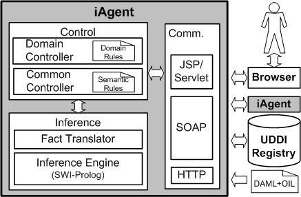The iAgent uses the communication layer to interact with outside world. It can request DAML+OIL documents from other web sites through HTTP protocols. It also can interact with users by JSP (Java Server Page) and Java Servlet, so users can submit tasks through browsers. Web Services provide communication protocols for iAgent to interact with other agents or systems, so iAgent can use SOAP (Simple Object Access Protocol) to invoke services or search services through the UDDI (Universal Description, Discovery and Integration) registry. The architecture of iAgent successful integrates advantages of Semantic Web and Web Services. So iAgent can manipulate knowledge by Semantic Web and cooperate with one another by Web Services to enable web automation.