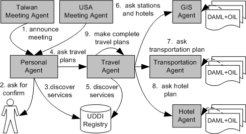 We use several iAgents to build a multiagent system, iTour. The aim of iTour is to arrange a trip for a meeting hold in Taiwan and Figure 2 shows the typical interactions among iAgents. In iTour, meeting agents manage meeting events and they can send meeting announcement to personal agents in DAML+OIL format. After personal agent receives the meeting announcement, it presents related information to the user. If the user would like to attend this meeting, he can tell the personal agent his preferences then request a trip plan for the meeting. Once receiving the request, the personal agent searches a travel agent from UDDI registry and asks the travel agent to provide a trip plan. To complete a trip plan, the travel agent needs to cooperate with other agents. First, it will ask a GIS agent to look for transport stations (railway stations and airports) and hotels nearby departure and meeting location. The transport stations and related constraints will be sent to a transportation agent then it will look for suitable transportation arrangements among these stations. Afterward, a hotel agent receives a list of nearby hotels and related preferences from the travel agent then chooses suitable hotels. Finally, the travel agent can integrate these possible transportation arrangements and hotels to work out complete plans according to user's requests. In iTour, Semantic Web makes iAgents able to manipulate knowledge of DAML+OIL documents and Web Services provide XML-based communication protocols which enable iAgents to find and communicate to one another.
