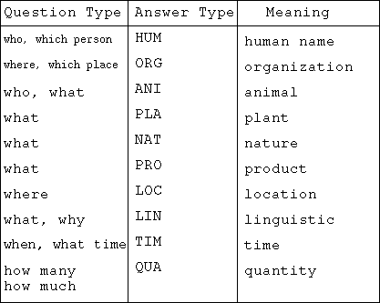 names as human type if the question is started with ``who''. The other types are detected with the table