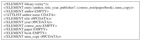 Figure 1 shows the architecture of the Compression Engine. This architecture is used for realizing the DSP technique. The ideas used in DSP are (1) to extract the structural information [2, 3] from the input XML document that cannot be inferred from a given DTD during the parsing process, and (2) to group the data elements in the document based on their corresponding tree paths in the DTD tree. The structural information here refers to the values of operator occurrences such as repetition operators (* and +), optional operators (?) and child indices of decision nodes (|). Data elements here refer to attribute and PCDATA values within the document. In DSP, two objects of a SAX event stream [8] and a tree data structure are adopted to model a given XML document and a given DTD, respectively. The generation of a SAX event stream is done by the XML parser whereas the creation of a DTD tree is done by the DTD tree building module which utilizes the outputs from the DTD parser (as depicted in Figure 1). For example, a DTD tree built based on the DTD given in Figure 2 is shown in Figure 3. This technique solves the long compression time and large memory consumption problems in [2, 3], since XML data is converted into a SAX event stream and only a small portion of the stream is resident in the main memory of the engine at run-time.