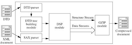 The generated SAX event stream and the created DTD tree are passed to the DSP module which performs structural information extraction and data elements grouping. The module uses a pseudo-depth first (PDF) traversal to traverse the DTD tree with respect to the SAX event stream in order to explore the required information. PDF traversal means that the module performs a depth-first traversal until an operator node or a choice node is encountered. The module then determines which of the traversal paths is followed in the next step. For operator nodes, a bit is used to indicate if the next SAX event token matches the current DTD tree node. The bit also tells the decoder whether the module has traversed the subtree of the operator node in the current parsing state. For choice nodes, each edge to a corresponding child is labelled with an index starting from 0. A byte is used to indicate which of the child nodes matches the next SAX event token. The byte value also shows the path that the module has taken to traverse the tree.