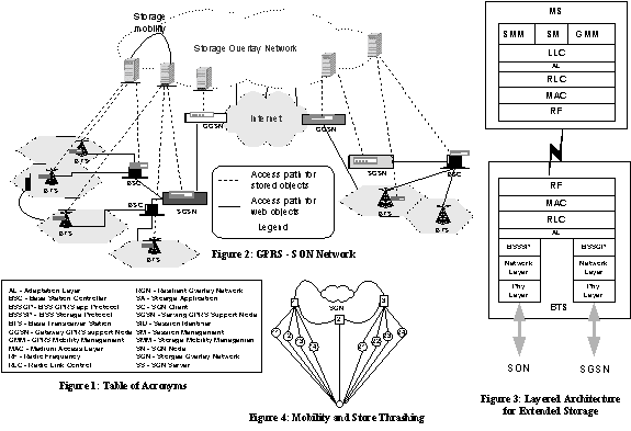 RON (Fig. 1 provides a table of acronyms) is an architecture that allows end-to-end communication across the wide-area Internet to detect and recover from path outages and periods of degraded performance within several seconds [1]. Using the overlay concept, we have proposed storage overlay network on top of a wireless network. The overlay nodes in storage network provide extended storage to mobile users and also manage the users’ stores and storage-related requests. Further, SON nodes manage the mobility of a user’s stores to an easy access store when the user is roaming and provides extended storage to the user anytime anywhere with minimum delay. The storage nodes in the SON are connected by means of high-speed connectivity to aid in faster access to stored data. SON can be IP based or SAN based and can also be geographically distributed.