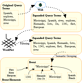 We then cluster the terms into different semantic groups using a modified version of the algorithm outlined in [4]. We believe that the knowledge embedded in the Web about this QA Event can be modeled and represented by the semantic groups. From the semantic groups derived, we form a structured query by selecting key terms from the semantic groups. The structured query is then passed to the document retrieval and answer selection engines to extract the exact answers from the top returned documents. For example, for the question "What Spanish explorer discovered the Mississippi River?", the semantic groups we obtained after performing the knowledge modeling and clustering are illustrated in Figure 1. The figure clearly shows that we are able to extract different aspects (or elements) of the QA event, such as the time (1541), the name of the river (Mississippi), the name of the explorer (Hernando De Soto), the nationality of the explorer (Spanish or French) and other descriptions(First, River, European). One promising advantage of our approach is that we can answer any factual questions about the elements in this QA event. For instance, "When was Mississippi River discovered?" and "Which river was discovered by Hernando De Soto?" etc.