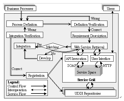 Step 5. Integration verification and service registration. The integration verification module checks the reachability, deadlock and the execution state of the service process. If there is nothing wrong, the new service will be registered at the Service Grid and also the UDDI repositories. Otherwise, the modification of the process definition is triggered.