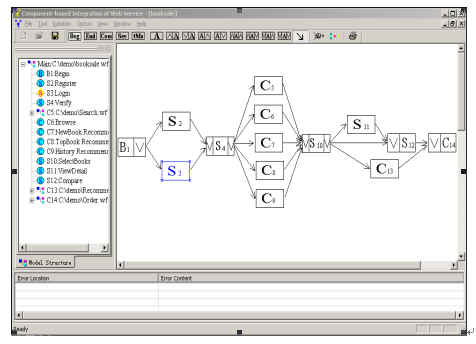 A component-based Web Service process definition tool has been developed to assist users to transform a business process into a service process. The interface of the definition tool is shown in Figure 3. The menu and the tool bar for operating the service process are arranged at the up portion. The scalable component hierarchy of the current process is arranged on the left portion. The service process component to be defined is arranged on the middle-and-right portion. The verification information including the error location and error content is displayed at the bottom portion. There are two kinds of basic elements in a service process: nodes and arcs. Nodes denote components of a service process, while arcs denote the data flows and control flows.
