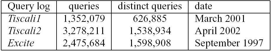 In order to evaluate the behavior of different caching strategies we used query logs from the Tiscali and EXCITE search engines. In particular we used Tiscali1, and Tiscali2, two different traces of the queries submitted to the Tiscali WSE engine (www.janas.it), and Excite, a publicly available trace of the queries submitted to the EXCITE WSE (www.excite.com) (Table 1). Our analysis shows that a) there are a certain number of queries which are frequently requested, and b) given a request for the i-th page of results, the probability of having a request for page (i+1) in the future is about 0.1 for i=1, but becomes approximately 0.5 or greater for i>1.