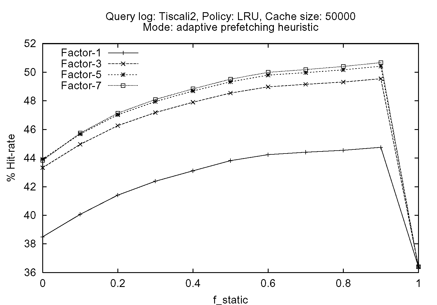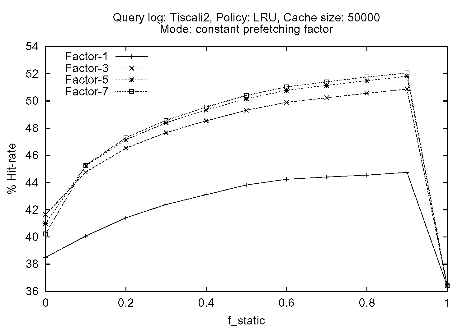 Figure 1 shows the hit rates achieved on the Tiscali2 query log by varying the percentage of cache used as static fstatic, and the prefetching factor k, whose tested values were 1 (no prefetching), 3, 5 and 7. The replacement policy adopted for the dynamic portion of the cache was always LRU. We chose the LRU policy because our tests demonstrated that while for cache organizations where the number of dynamic cache blocks predominates (i.e., small values of fstatic, the LRU-2S, FBR, or LRU/2 replacement policies outperform LRU and 2Q, the opposite often holds when the percentage of static cache blocks is increased.