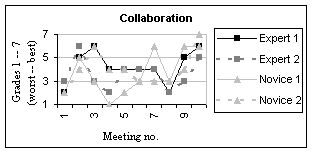 The collaboration in the groups can be considered to have seen chaotic at the beginning. During the first session the participants had several problems, with usage of the technology and with each person having to focus on the three others all the time in the virtual world, looking at the text messages and checking whether they match what can be heard via the audio. The novices had to handle two new tools AW and the audio at the same time. Already the first meeting showed a need for structuring the sessions. Even though the initial plan was to try to have unstructured sessions, the need for greater coordination became increasingly obvious. After the first session in the virtual environment, a few minutes at the beginning of each meeting were spent on structuring the activities, the collaboration, and deciding who would do what together with whom. The estimated collaboration is shown in Figure 1.